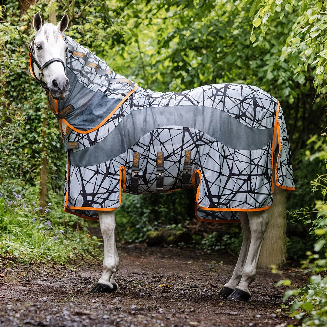Three straight surcingles give more belly protection and the generous tail and leg flaps offer extended protection. Other features include a detachable hood, disc front closure and lining on the shoulders, mane and tail
