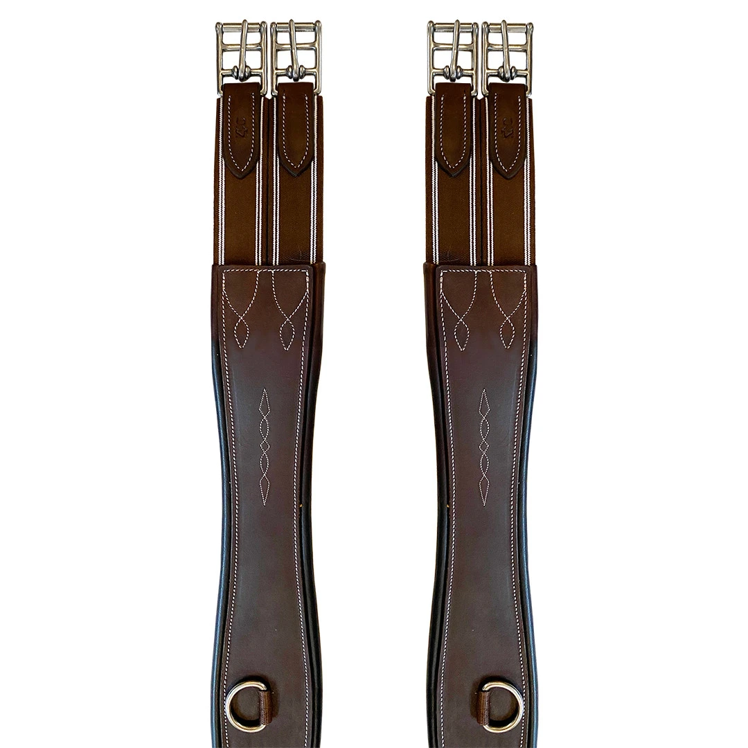 You’ll love this fancy stitched, padded leather girth from Belle & Bow! It features double elastic at both ends in a nice, tasteful brown. The rounded buckles are stainless steel as is the center ring, perfect for attaching a martingale or draw reins.