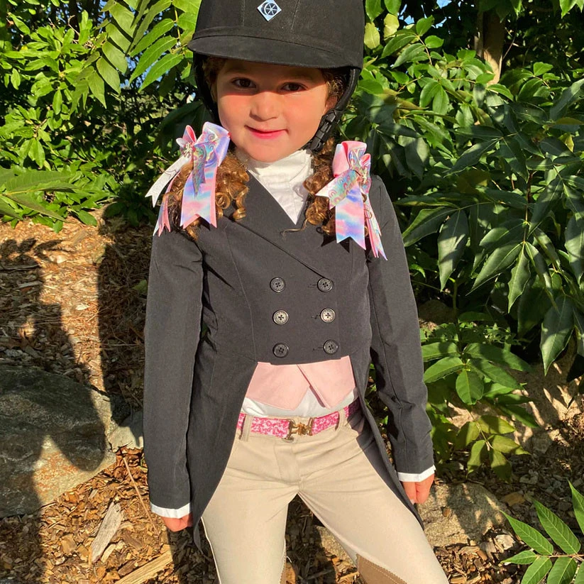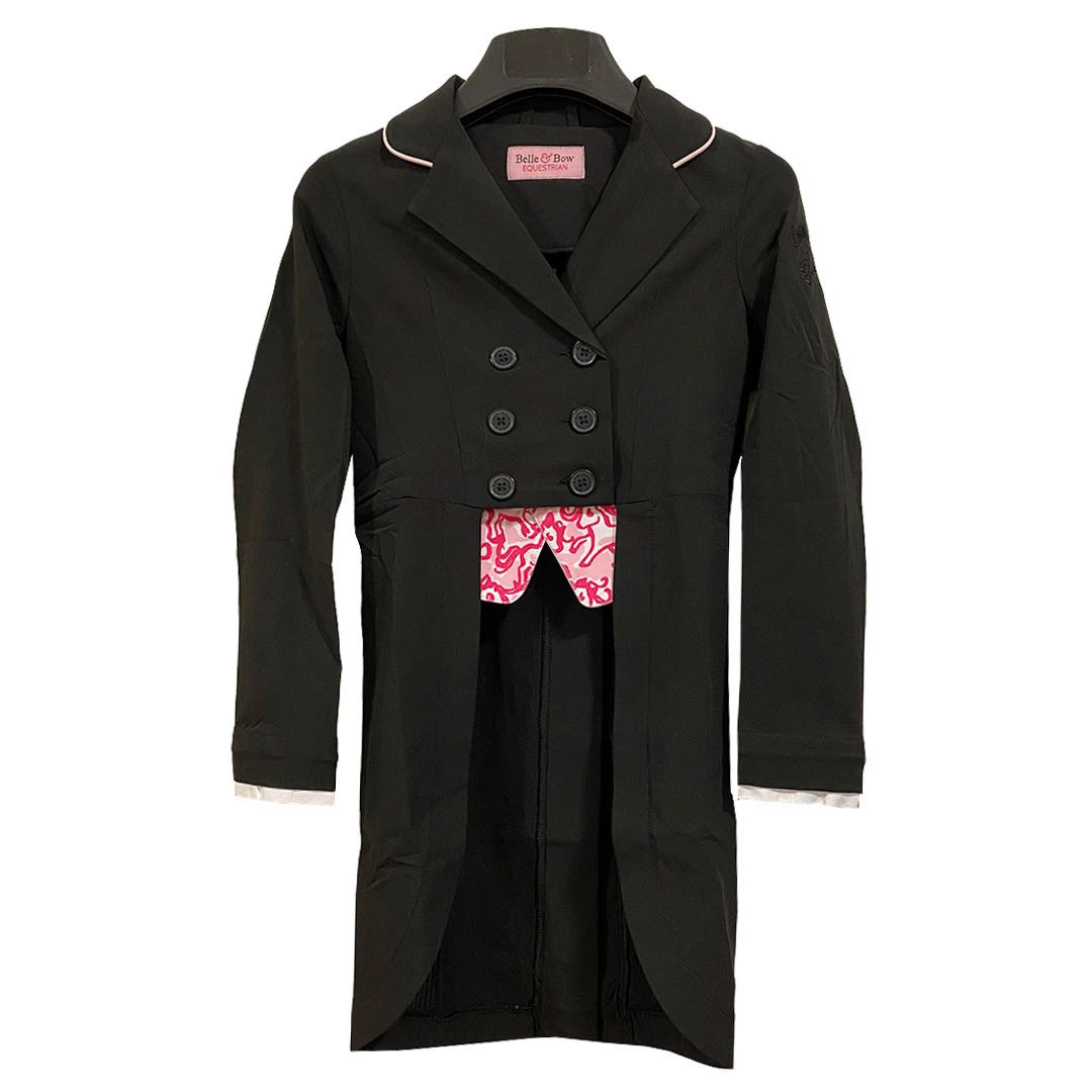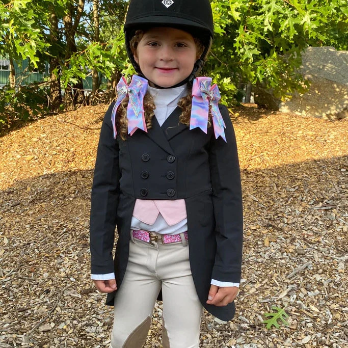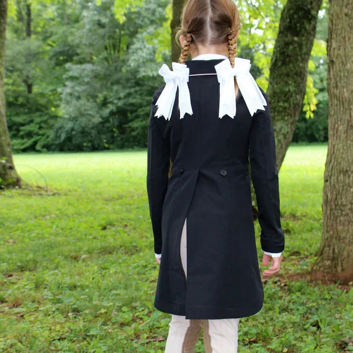 The Belle & Bow Shadbelly is made for kids going in formal pony classes. Young girls love the look of this elegant black show coat with pale pink piping on the collar.