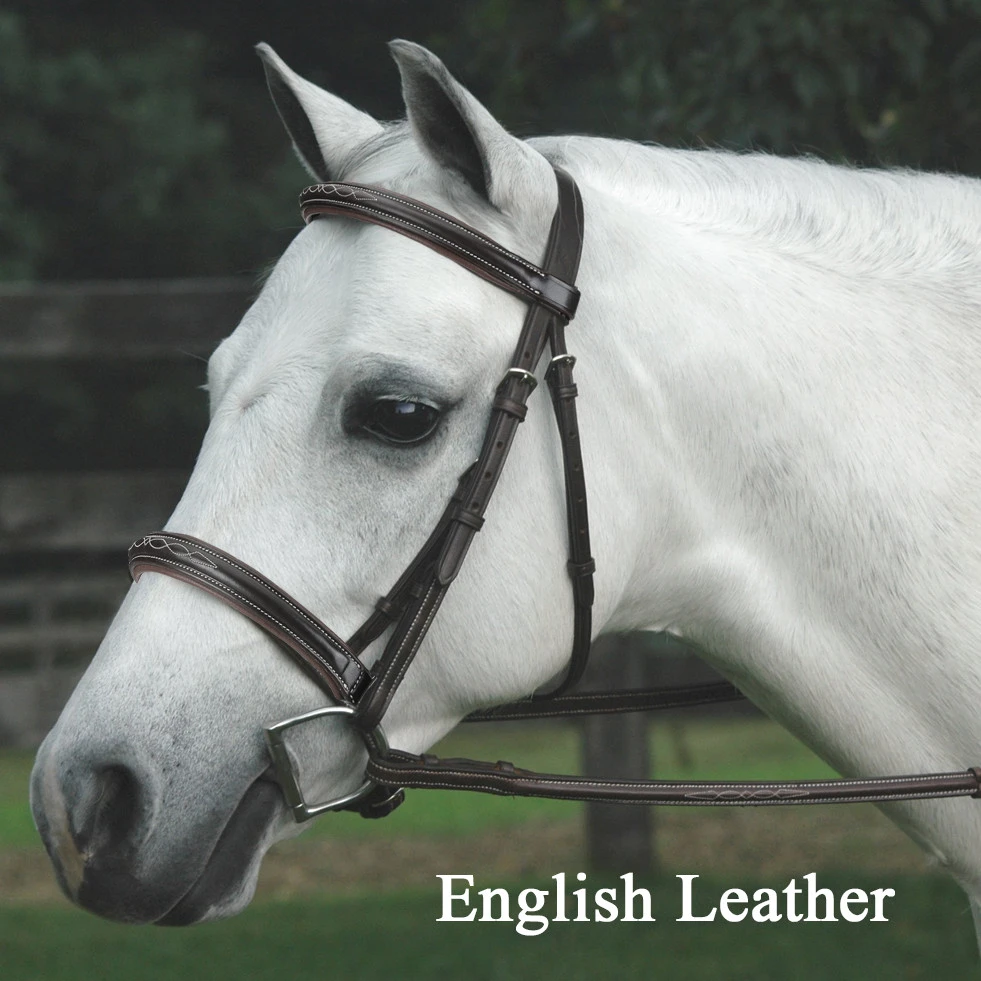 Made with fine English leather and superb craftsmanship, this is a super comfortable bridle. It includes soft, dark brown padding on the noseband and browband. The crisp, white stitching is even and tight – 14 stitches per inch.