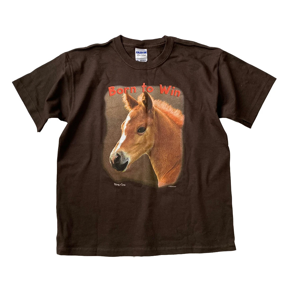 An adorable pony foal is front and center on this Ultra Cotton Tee. Under the slogan ‘Born to Win’ is a chestnut foal with a star, stripe and snip plus cute fuzzy ears and big expressive eyes.