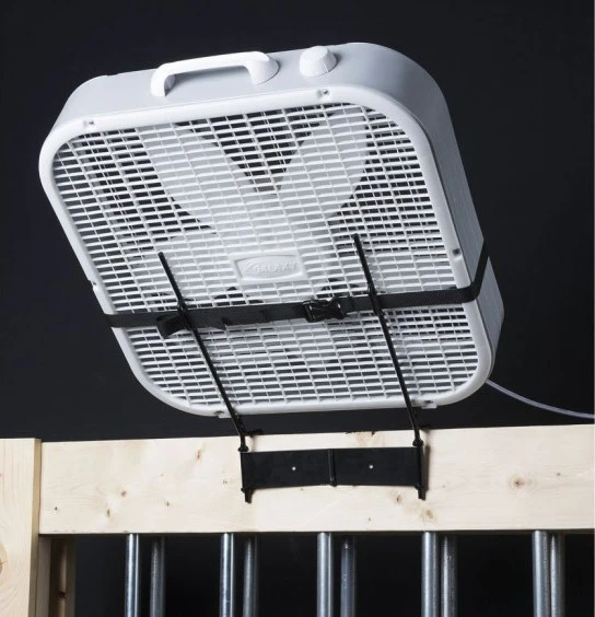 Easily holds standard size box fans above the stall and angled down for optimal air flow.