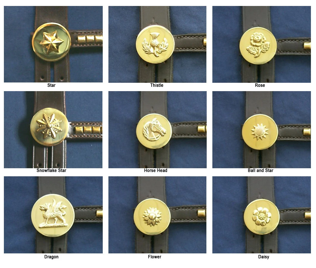 Add the finishing touch to your in-hand bridle with these solid brass, fancy center rosettes. Imported from England, they have a loop on the back and securely attach to the browband and crown piece.