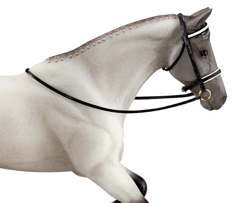 This is an authentic, adjustable leather dressage bridle with white trim. Will fit traditional size models (1:9).