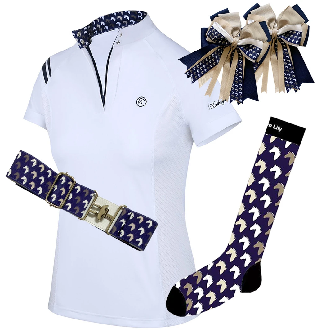 With a zip/snap collar this shirt transforms quickly from a trendy polo to a classic all white show shirt. Pair with the matching belt, socks and bows (sold separately) to have a completely matching look!