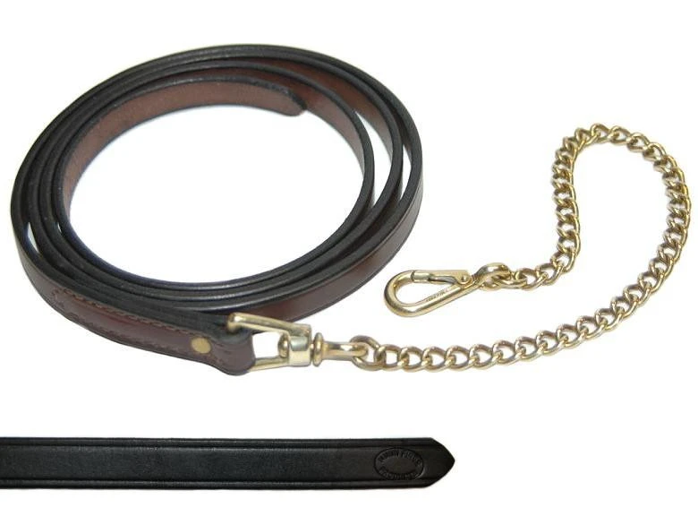 The lead is made from bridle leather and comes in pony size – 3/4 inch wide and 5′ 10″ long. A solid brass 18 inch chain, made in England, is sewn on the end. There is also a brass rivet for added strength.