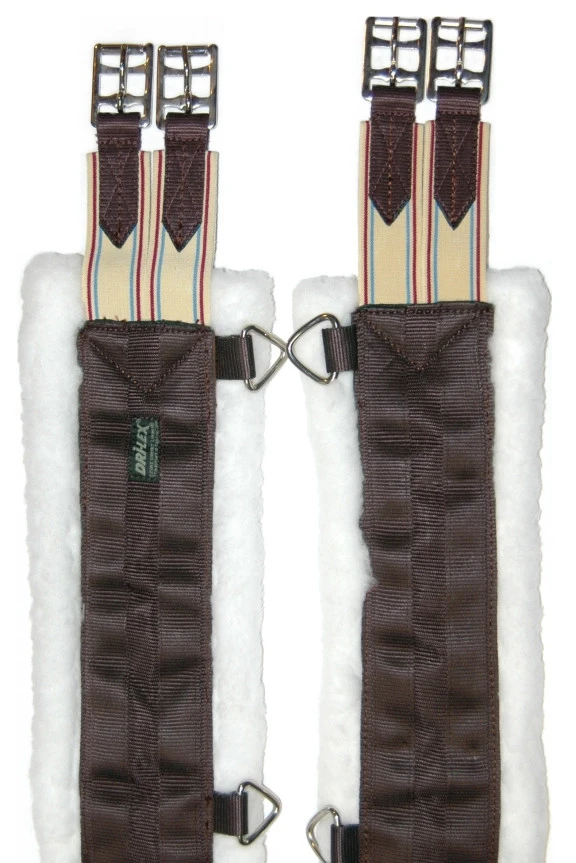 The brown nylon girths have elastic on all buckles for equalizing pressure and also have three rings designed to work with the Snap ‘N’ Go Side Reins.
