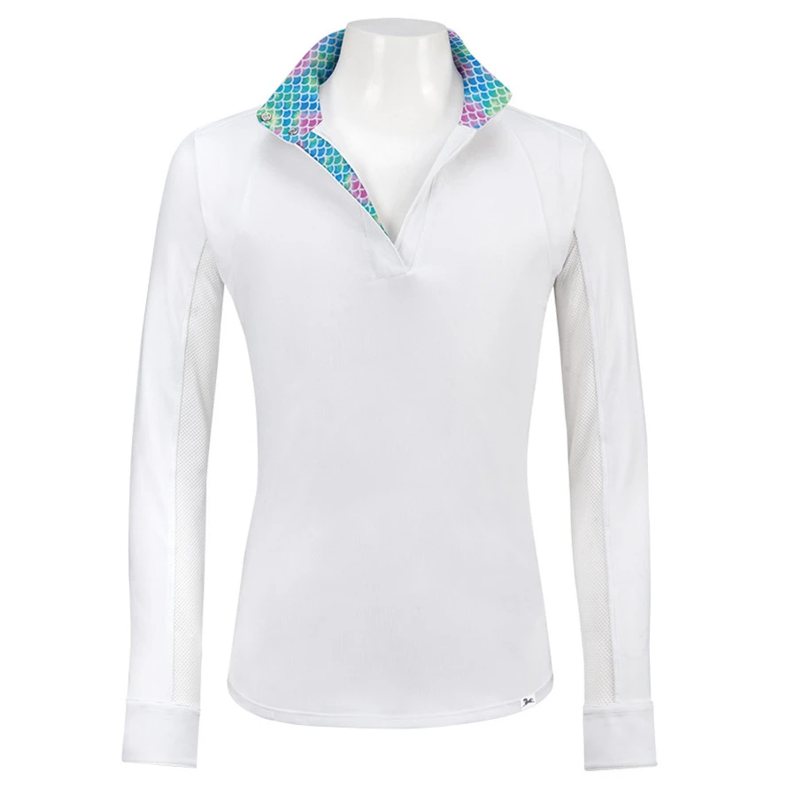 The particles are naturally derived and work for the life of the product (it will never wash out!) This style also features mermaid tie dye trim, textured mesh under-arm panels and a zipper placket with snap collar.