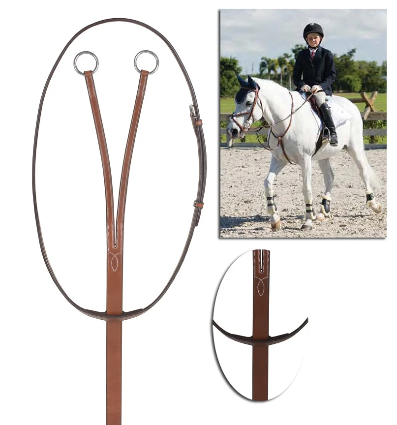 The running martingale has decorative stitching and comes in a handsome natural brown oakbark color.