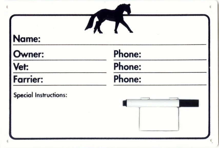 Easily display your pony’s name, owner, vet and farrier with phone numbers. There’s plenty of room for feeding or special instructions too.