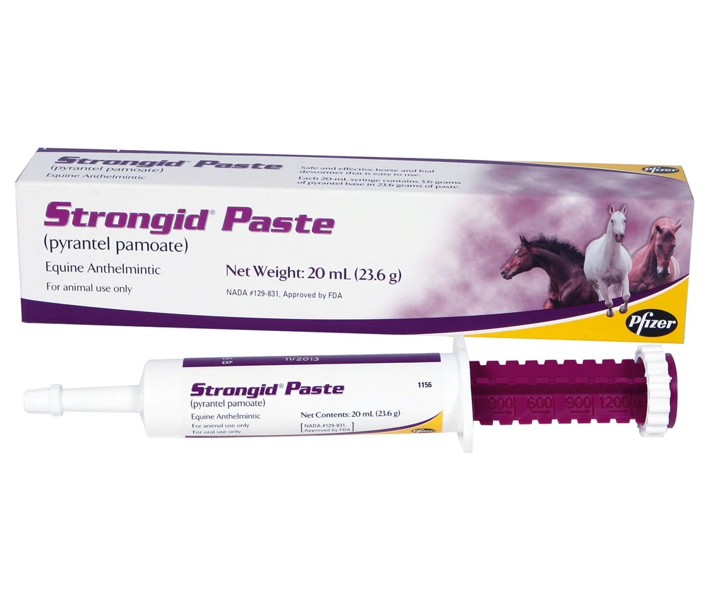 One 23.6g Strongid Paste syringe treats 1200lbs. It’s safe for adult horses, foals older than 2 months. Each 20-ml syringe contains 3.6 grams of pyrantel base in 23.6 grams of paste.