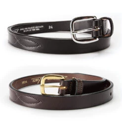 These traditional equestrian belts are specifically designed for kids with a 1″ width and one fancy stitched area. This space is the perfect place for a name plate if desired. Manufactured by Tory Leather Company, they’re made from the finest bridle leather from Wickett and Craig. Beautifully designed with top craftsmanship and style.