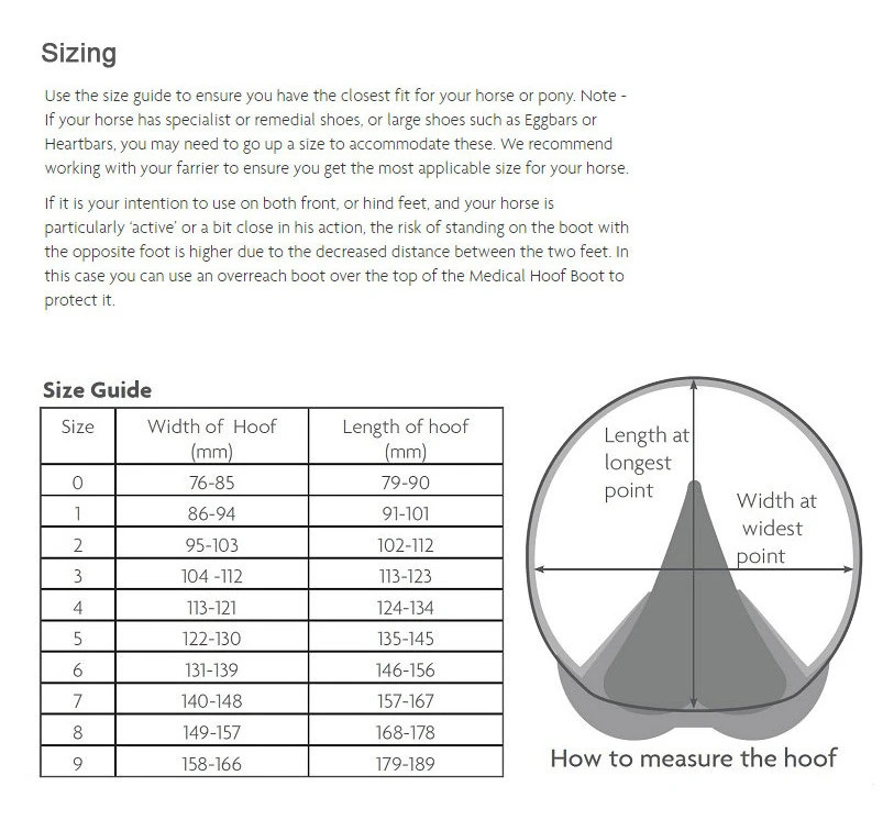 See the size chart and measure carefully. The boot is designed to be a snug fit so it doesn’t fall off. If you don’t measure accurately or buy a size too big it can result in damage to the boot due to the boot being trodden on by the other foot. Measure the width carefully before bandaging, with or without shoe and choose per the size chart – don’t go to next size up. There’s no need to add extra for dressings.